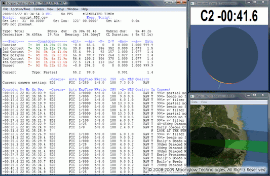 Watch the Eclipse, Not Your Camera! This software allows you to use your Windows laptop to automatically control a Canon or Nikon DSLR during solar eclipses and Mercury transits, leaving you free to observe visually. Scripts can be tested beforehand and tuned for the most reliability.
