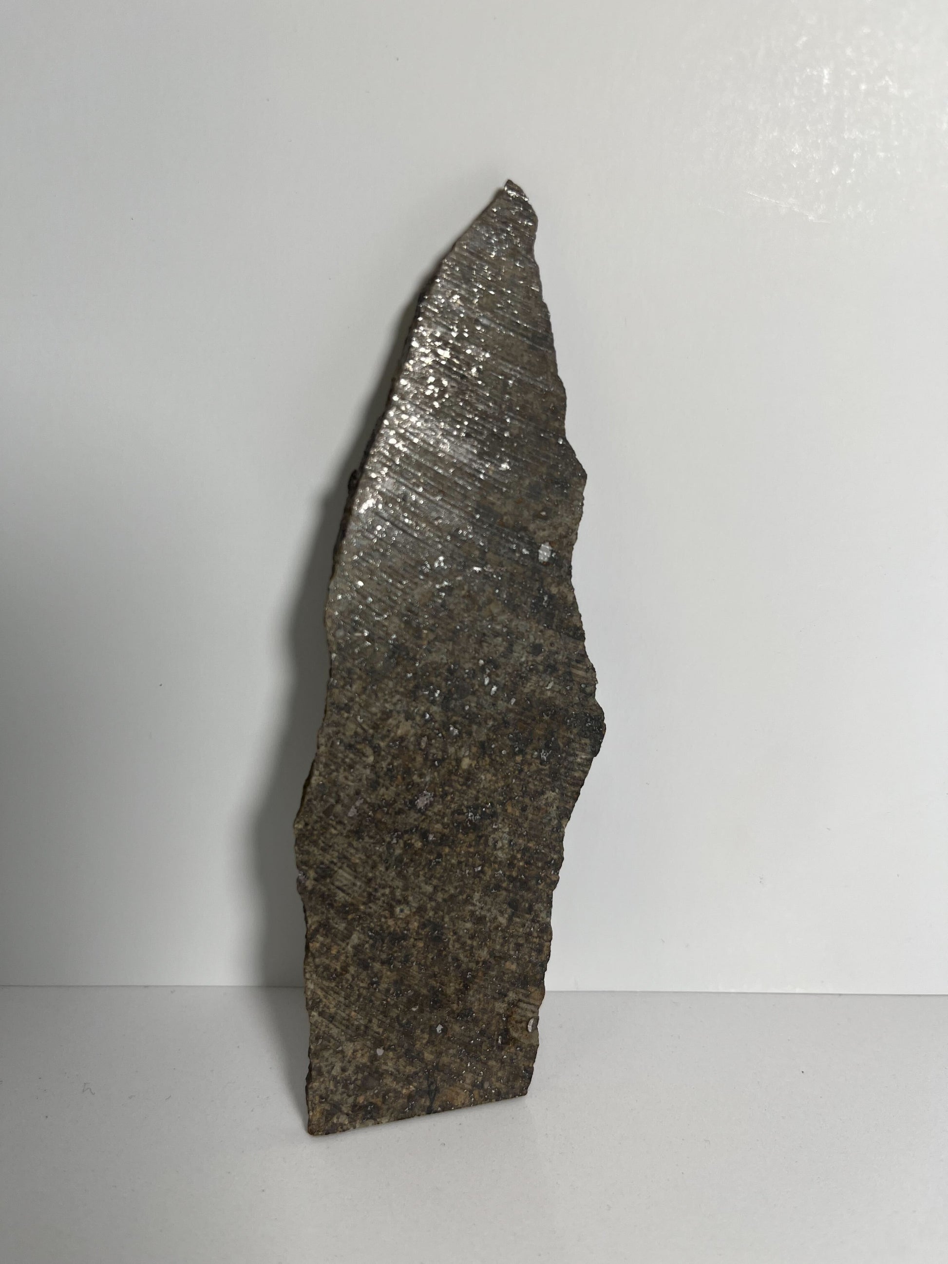 Slice from "Tazizilet" meteorite recovered in Niger, Africa at 17°38.628’N, 9°26.485’E in 2006. This rare, low iron stone meteorite was recovered in 2006 in Agadez, Niger; only one of three meteorites ever recovered in that country. Only one specimen with a total gram weight of less than 1 kilogram was recovered.