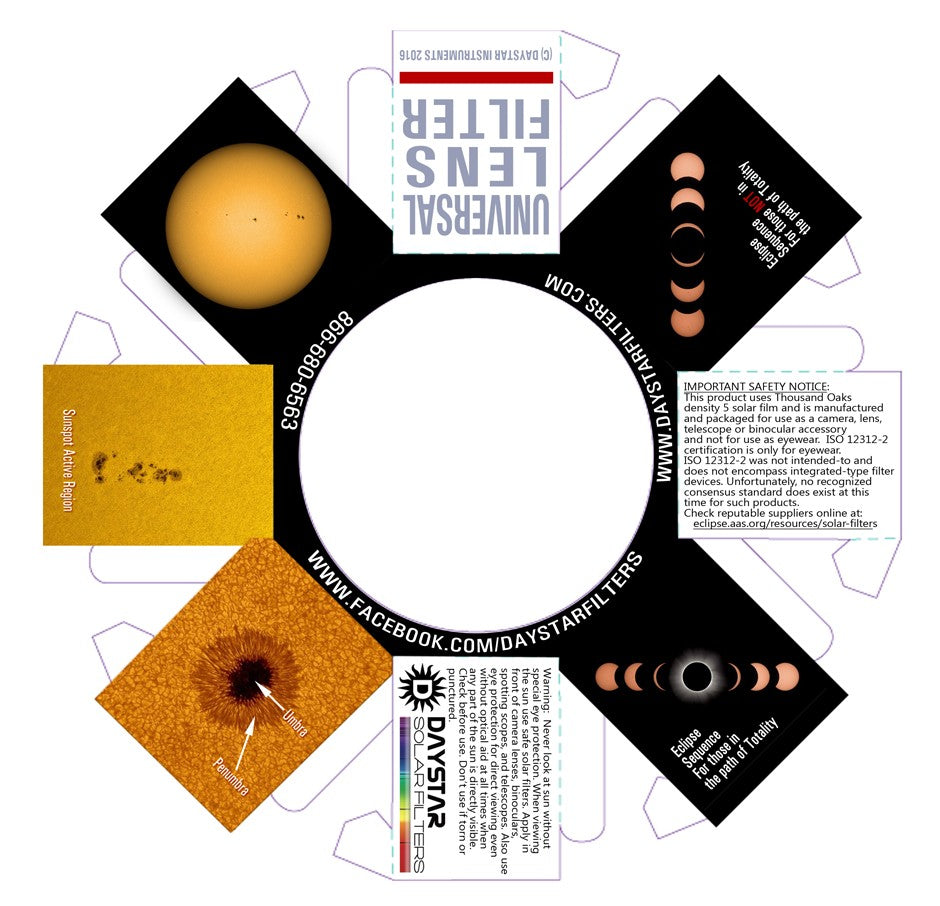 Safe Foldable Solar Lens Filter for Cameras. Use to safely photograph partial solar eclipses, total solar eclipses, or to view or photograph the sun anytime!